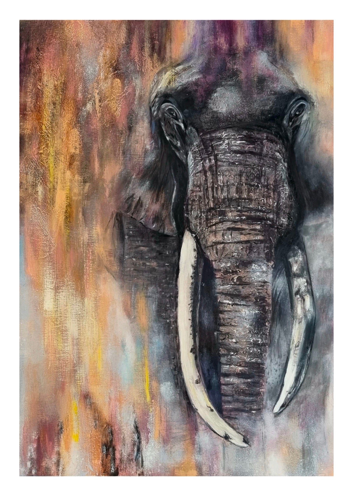In "Strength," I've sought to capture more than just a magnificent creature; I've aimed to embody the profound truths it represents. The central figure is the mighty elephant, a universal symbol of wisdom, resilience, and the power of memory. I've crafted this work in oil over textured mixed media, building the elephant's trunk with sculptural layers of modeling paste to create a tactile realism that invites you to truly feel its grounded power.
