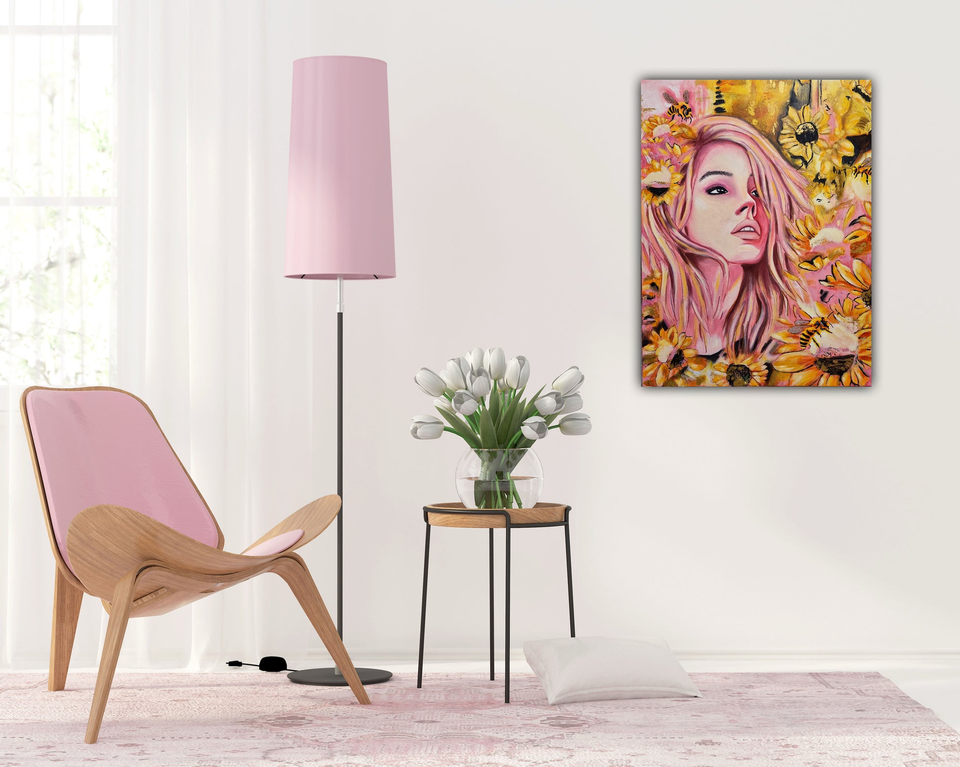 I chose sunflowers for their powerful symbolism: they are radiant seekers of light, standing tall and turning always toward the sun — a reminder to hold onto hope and keep rising, even through pain. The bees, vital and tireless, represent endurance, community, and the often unseen work it takes to survive and thrive.