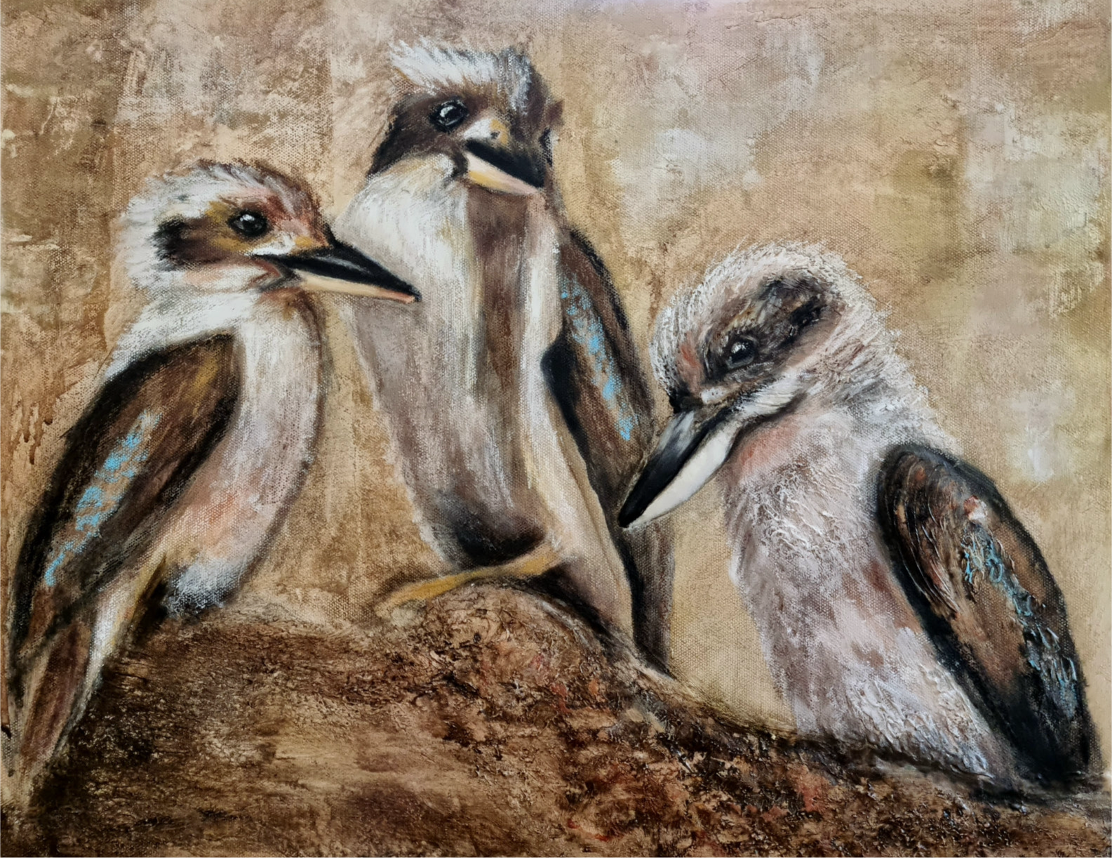 Working with oil over a foundation of rich, mixed media textures, I wanted to create a sense of grounded, earthy wisdom that perfectly frames the exuberant spirit of these magnificent birds. The canvas itself has a history, a story of its own, before the kookaburras appear—just as joy exists as a deep, underlying truth before it erupts into laughter. These three kookaburras, in their quiet conversation, seem to be sharing a secret—the simple, beautiful knowledge that life is meant to be enjoyed.